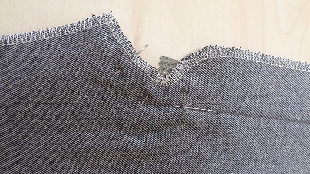 Von der anderen Seite den Schlitzbeleg zur Seite feststecken, damit er beim Nähen nicht mit angenäht wird.